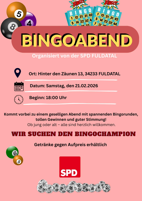 Fuldatal: Mit einer 28-köpfigen Kandidatenliste geht die Fuldataler-SPD in den Kommunalwahlkampf 2026, so der Beschluss der letzten Mitgliederversammlung im November 2025. Die Kandidaten sind zwischen 22 und 71 Jahre alt, die Liste besteht aus 12 Frauen und 16 Männern, man sieht neue Gesichter sowie „alte Hasen“ und wie immer sind Bewerber aus allen Ortsteilen vertreten. Dieses Ziel, das der SPD seit Jahrzehnten immer eine Herzensangelegenheit ist, haben wir seit der Gebietsreform 1970 immer den Wählern bieten können. Die Liste stellt sich in folgender Reihe auf: Stefanie Roß-Stabernack, Sevda Aral, Thomas Scheklinski, Dirk Eberhardt, Jörg Moldenhauer, Luca-María Hildebrandt, Andreas Brand, Silke Hildebrandt, Armin Scheklinski, Birgfried Stabernack, Jessica Frank, Stefan Schurig, Heidrun Gottschalk, Salaha Rahimi, Friedhelm Volland, Gabriela Trabner, Jonas Polikowski, Joanna Kublik, Alisa Koch, Sascha Brede, Kirsten von der Ehe, Michael Thöne, Manfred Dörrbecker, Johannes Hetzer, Jörg Buschbeck, Susanne Murphy, Gerhard Pressler und Winfried Schiel. Wir freuen uns auf einen fairen Wettstreit.